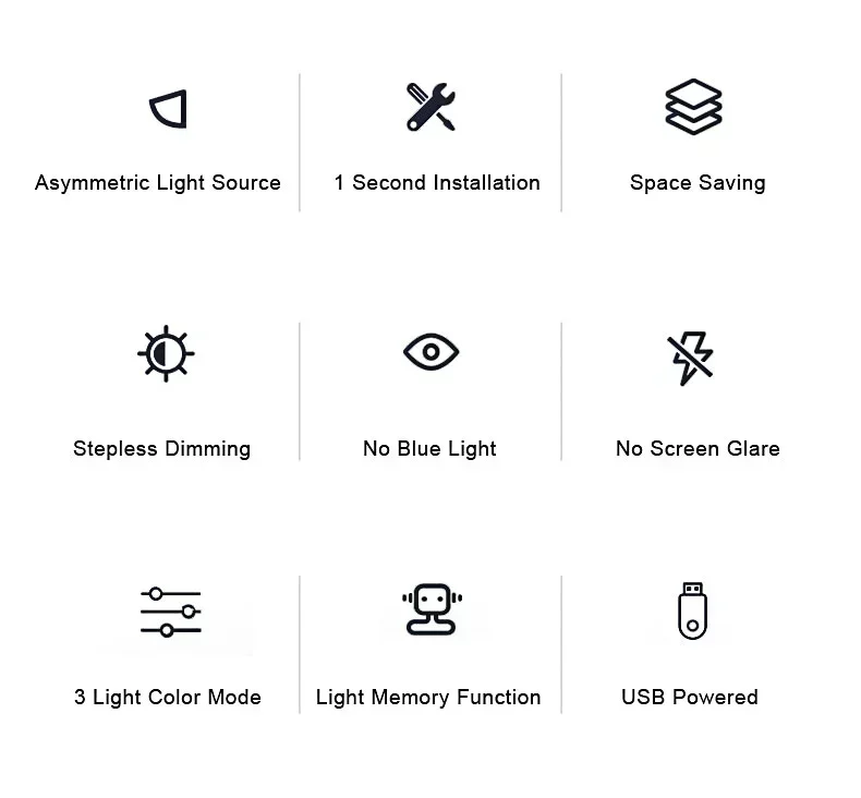 Functional features: timed 60 minute light off function, infinite dimming, quick reading mode, three color temperature adjustment, asymmetric light source