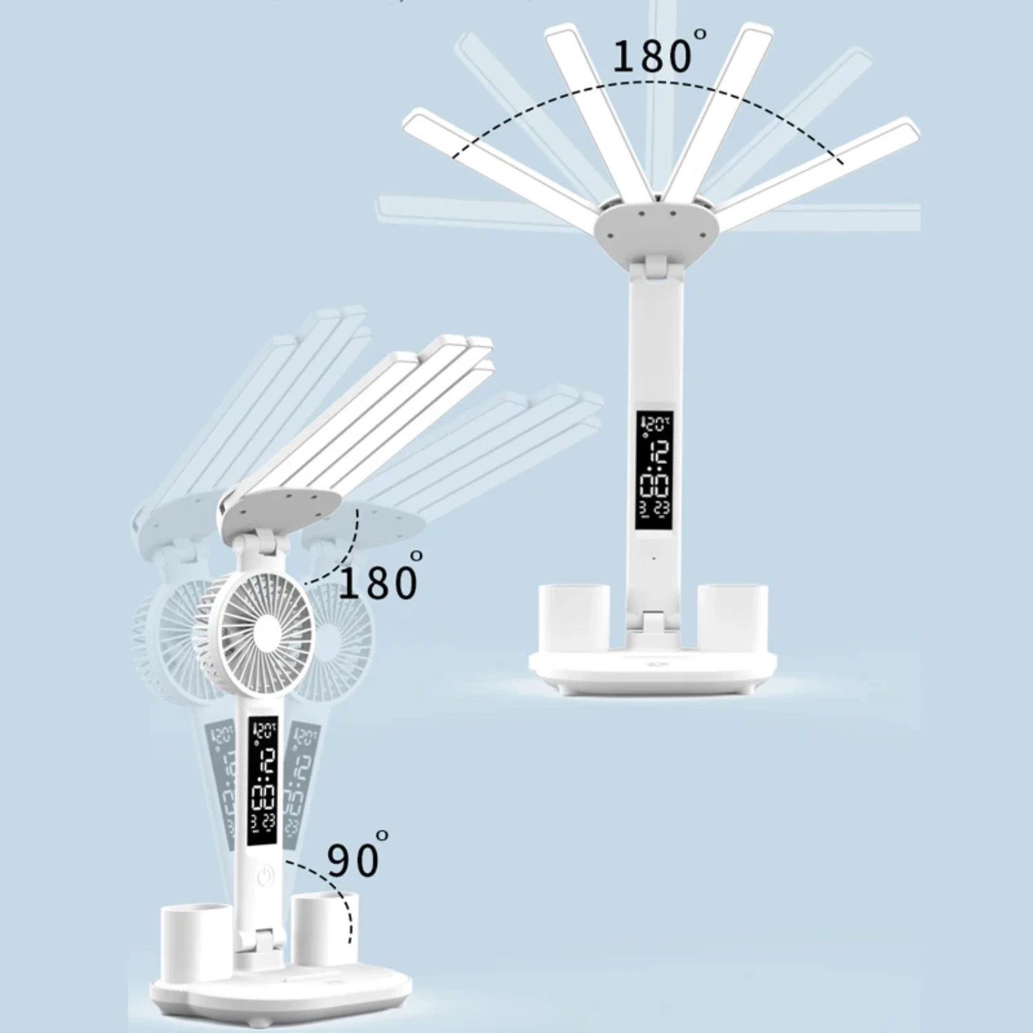3in1 Multifunction Table Lamp LED Four-headed Folding With Fan Calendar Clock USB Rechargeable Desk light 3 color Reading Lamp