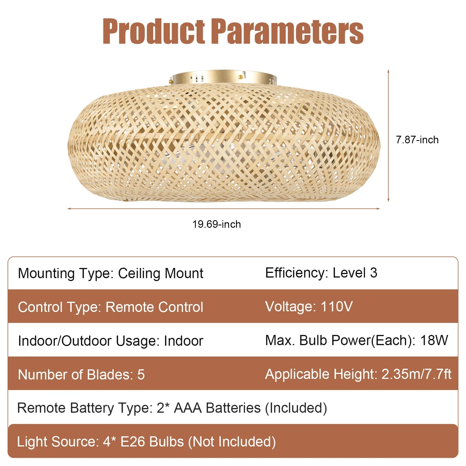 Excellent Lighting Effect: The 4 E26 lamp holders are compatible with a wide range of this type of bulb with a maximum power of 18W (each), providing you with a lighting area of 107.6-161.4ft². The light casts a soft and beautiful pattern on the ceiling through the woven rattan textured shade, creating a warm and romantic lighting effect.