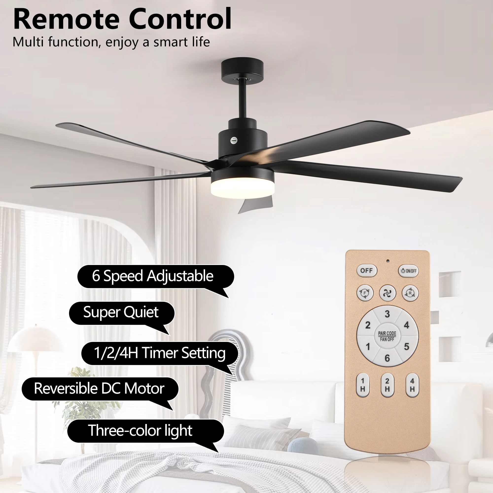 65 Inch Black Ceiling Fan with Light, 5-Blade Dimmable LED Ceiling Fan with Remote Control, Modern Quiet Design