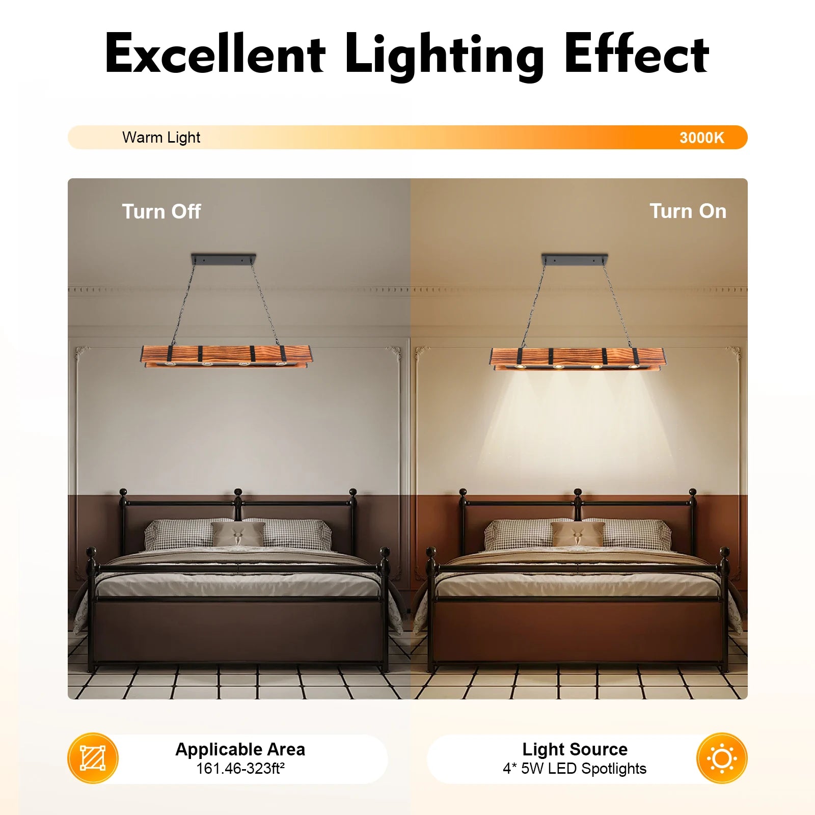 2. Four 5W LED spotlights ensure sufficient illumination with warm light, providing you with a lighting area of 161.46-323ft². It can not only be used as decoration in the room but also as an excellent home lighting device, making the room more atmospheric.