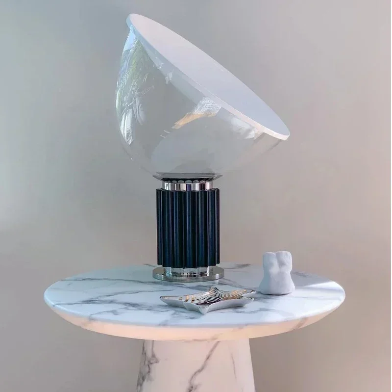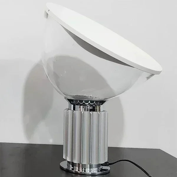 -Embracing its famous blown glass bowl diffuser, the Flos Taccia Table Lamp features the same proportions as its predecessor but is more compact and has been brought up-to-date with an LED light source, increasing the light's adaptability.Contemporary and stylish, this mobile lighting solution possesses clean lines with industrial characteristics and is the perfect addition to any space, both residential and commercial.